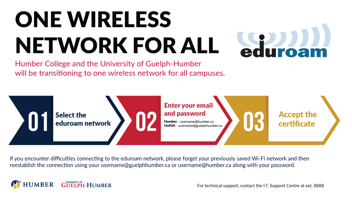 To connect to wireless internet, select Eduroam on your Wi-Fi enabled device. When you are asked to enter your username and password, use your Guelph-Humber UserID and password.